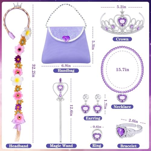 1 Led Rapunzel dress1 Bag1 Rapunzel wig with flowers and crown(comes with a led light string)1 Rapunzel crown1 Princess wand1 Necklace1 Earrings1 Rapunzel ring1 Bracelet2 Strips string lights for dress